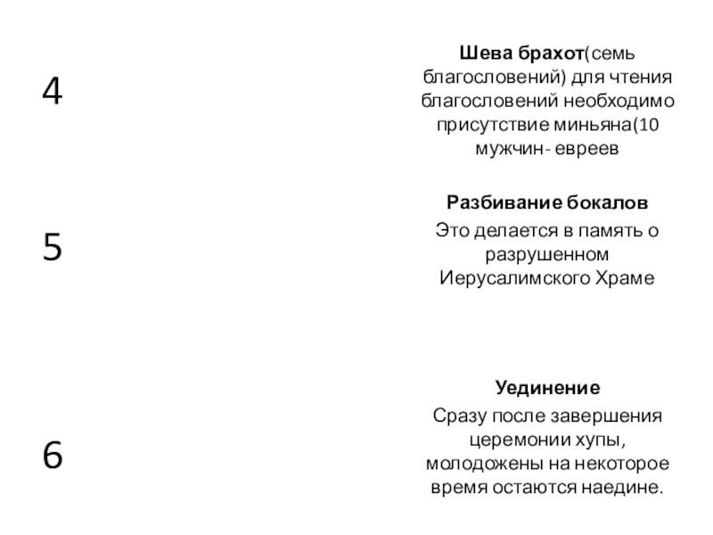 4   5    6Шева брахот(семь благословений) для чтения благословений необходимо присутствие миньяна(10 мужчин-
