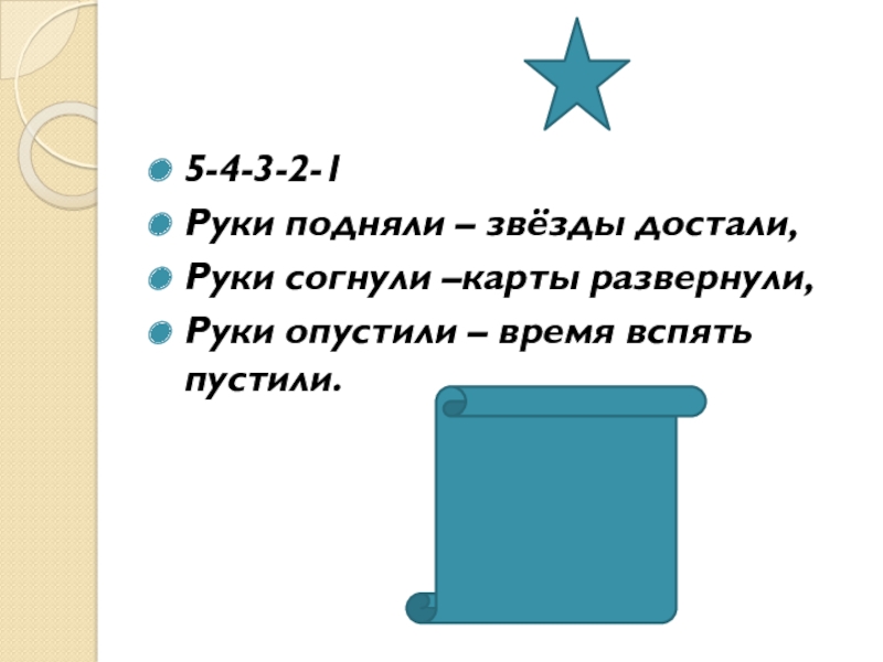 5-4-3-2-1Руки подняли – звёзды достали,Руки согнули –карты развернули, Руки опустили – время вспять пустили.