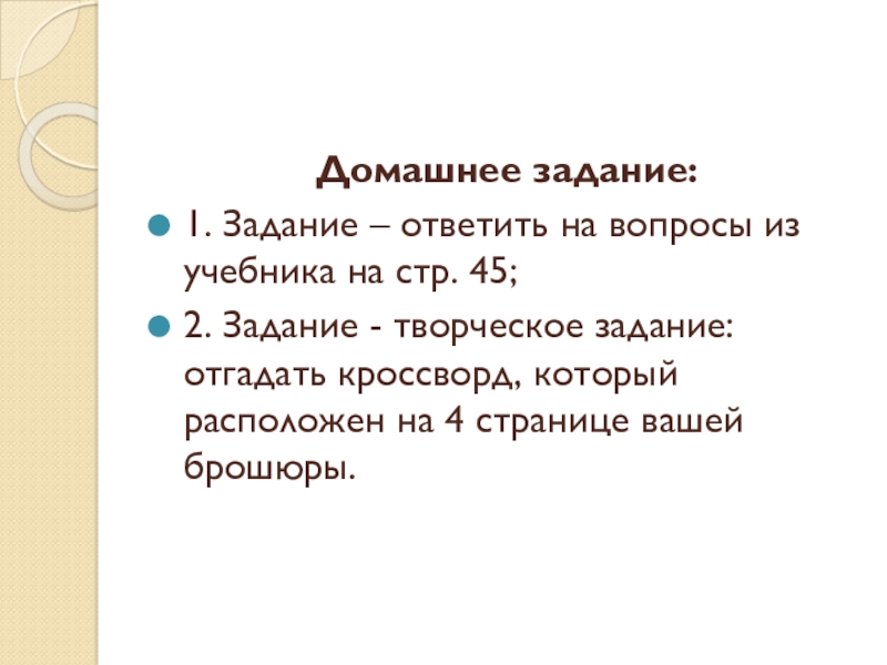 Домашнее задание:1. Задание – ответить на вопросы из учебника на стр. 45; 2. Задание - творческое задание: