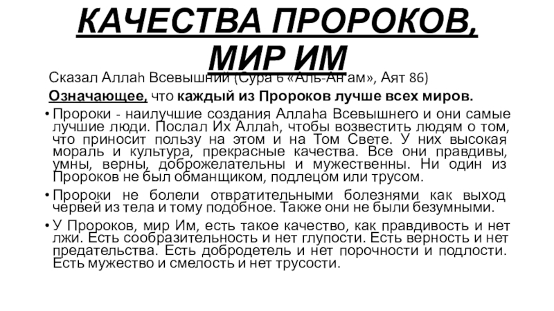 У Пророков, мир Им, есть такое качество, как правдивость и нет лжи. Есть сообразительность и нет глупости. Есть верность и нет предательства. Есть добродетель и нет порочности и подлости. Есть мужество и смелость и нет трусости.