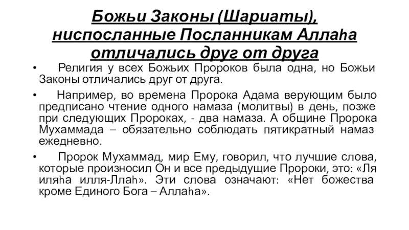 Слайд 14Божьи Законы (Шариаты), ниспосланные Посланникам Аллаhа отличались друг от друга