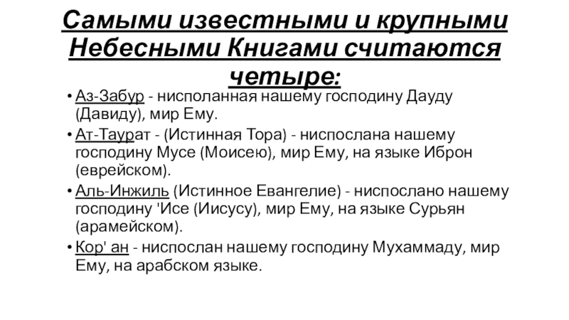 Слайд 6Самыми известными и крупными Небесными Книгами считаются четыре:
