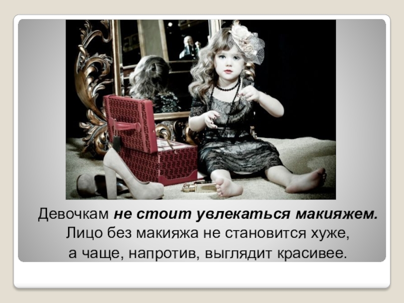 Слайд 8Девочкам не стоит увлекаться макияжем. Лицо без макияжа не становится хуже,