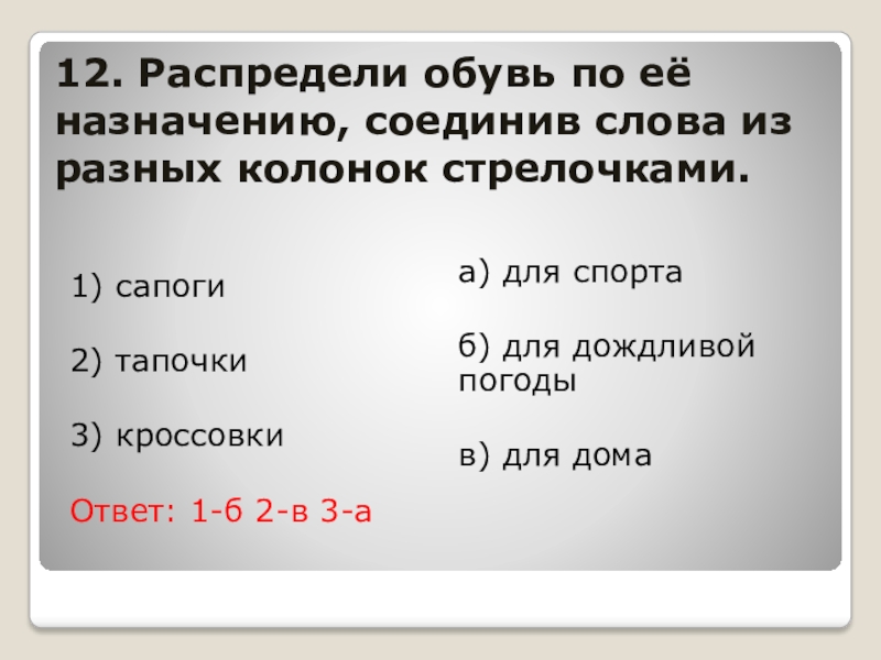 Слайд 3012. Распредели обувь по её назначению, соединив слова из разных колонок