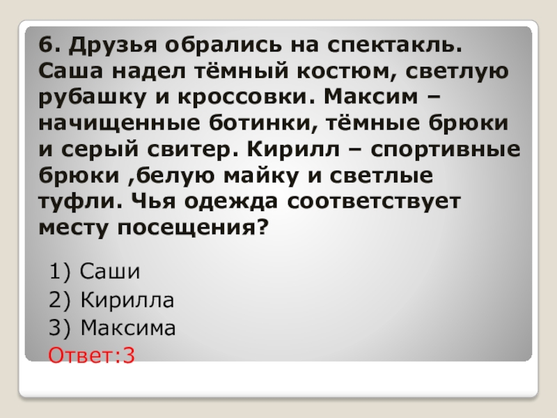 и кроссовки. Максим – начищенные ботинки, тёмные брюки и серый свитер. Кирилл – спортивные брюки ,белую майку и светлые туфли. Чья одежда соответствует месту посещения?