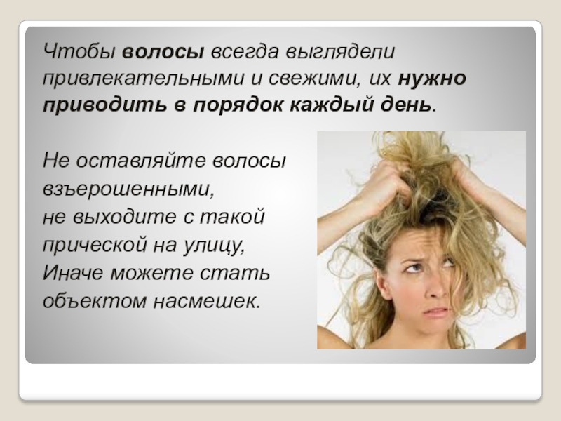 Слайд 7Чтобы волосы всегда выглядели привлекательными и свежими, их нужно приводить в