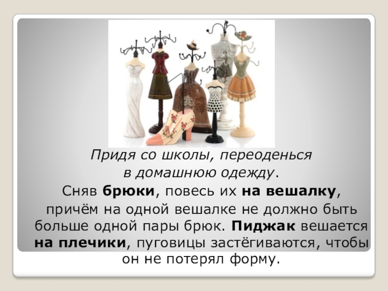 причём на одной вешалке не должно быть больше одной пары брюк. Пиджак вешается на плечики, пуговицы застёгиваются, чтобы он не потерял форму.