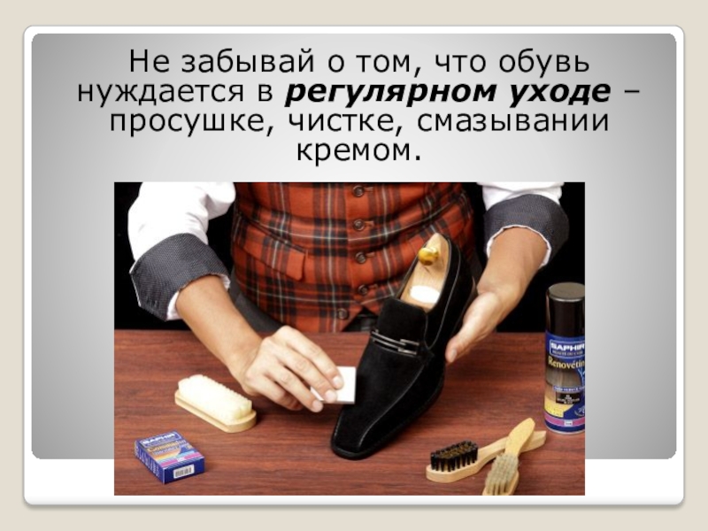 Слайд 15Не забывай о том, что обувь нуждается в регулярном уходе –