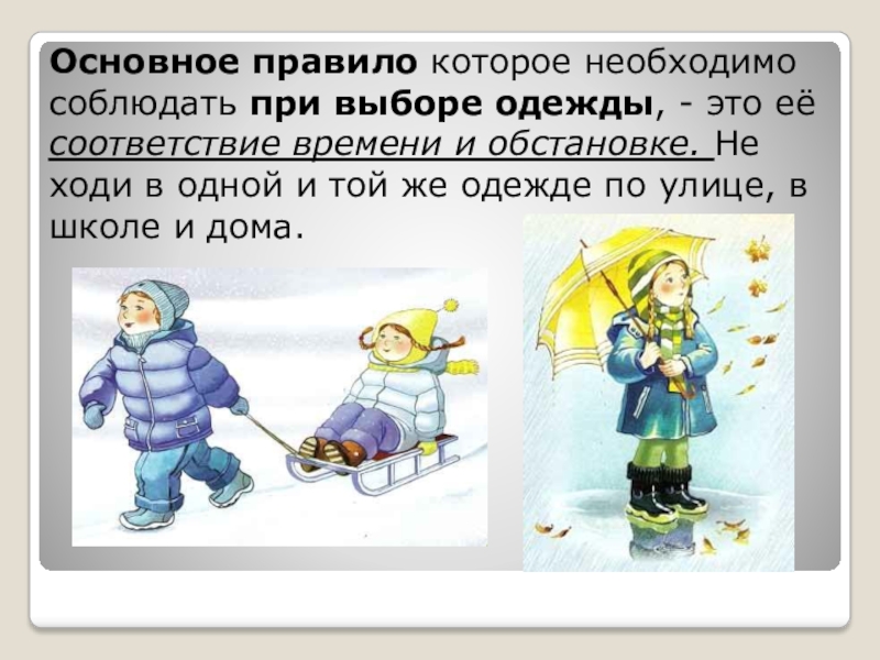 Слайд 10Основное правило которое необходимо соблюдать при выборе одежды, - это её