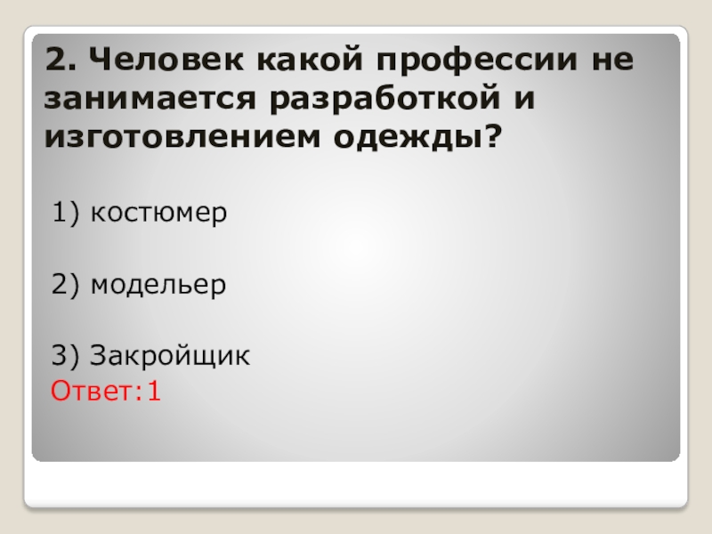 Слайд 202. Человек какой профессии не занимается разработкой и изготовлением одежды?