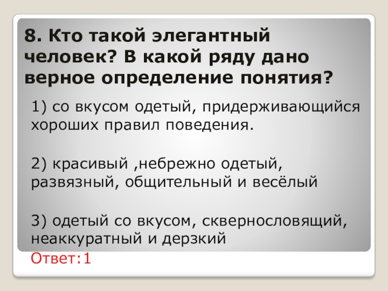 Слайд 268. Кто такой элегантный человек? В какой ряду дано верное определение