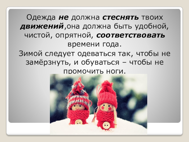Слайд 12Одежда не должна стеснять твоих движений,она должна быть удобной, чистой, опрятной,
