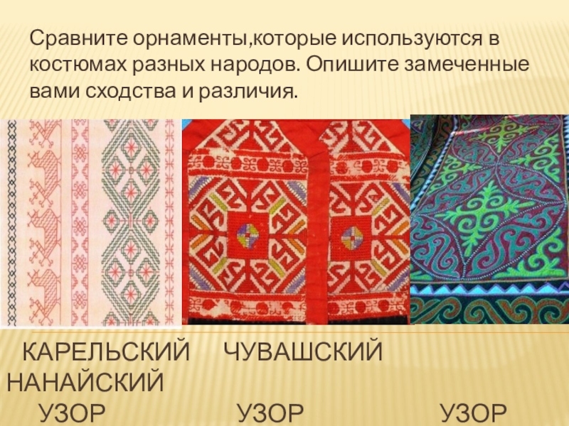 Сравните орнаменты,которые используются в костюмах разных народов. Опишите замеченные вами сходства и различия.