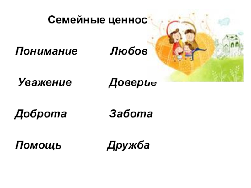 (любовь, дружба, уважение, труд, понимание, доверие и т.д.).