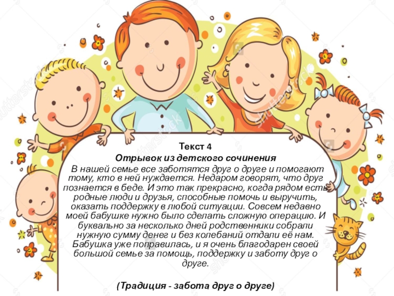 друг о друге и помогают тому, кто в ней нуждается. Недаром говорят, что друг познается в беде. И это так прекрасно, когда рядом есть родные люди и друзья, способные помочь и выручить, оказать поддержку в любой ситуации. Совсем недавно моей бабушке нужно было сделать сложную операцию. И буквально за несколько дней родственники собрали нужную сумму денег и без колебаний отдали её нам. Бабушка уже поправилась, и я очень благодарен своей большой семье за помощь, поддержку и заботу друг о друге.