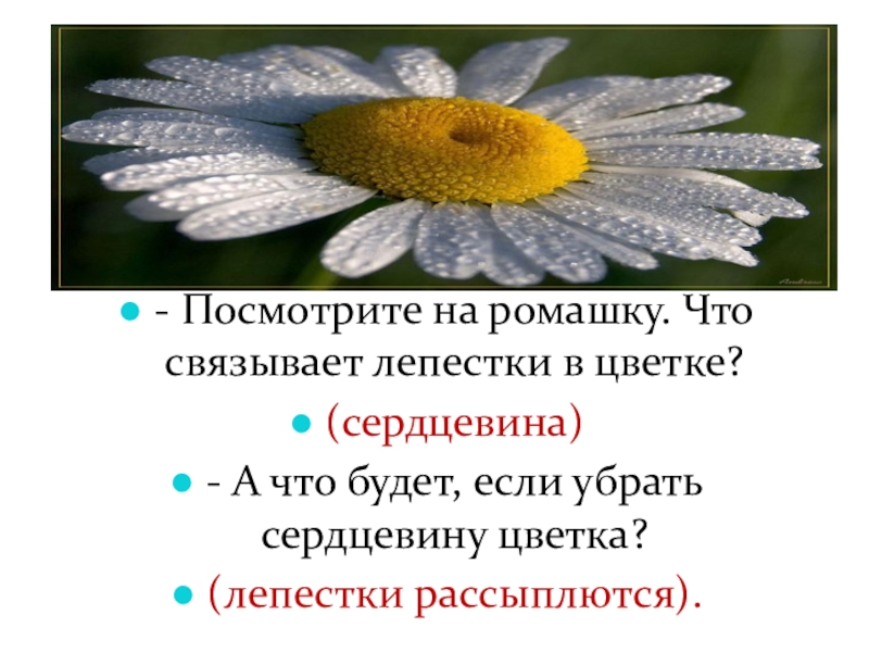 Слайд 6- Посмотрите на ромашку. Что связывает лепестки в цветке?
