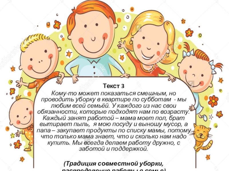 по субботам - мы любим всей семьёй. У каждого из нас свои обязанности, которые подходят нам по возрасту. Каждый занят работой – мама моет пол, брат вытирает пыль, я мою посуду и выношу мусор, а папа – закупает продукты по списку мамы, потому что только мама знает, что и сколько нам надо купить. Мы всегда делаем работу дружно, с заботой и поддержкой.