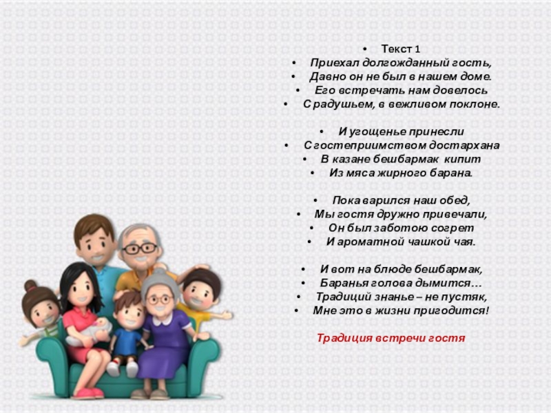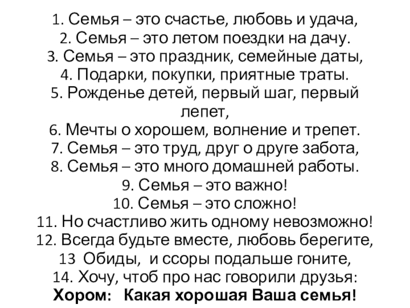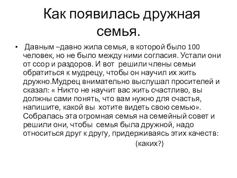 которой было 100 человек, но не было между ними согласия. Устали они от ссор и раздоров. И вот решили члены семьи обратиться к мудрецу, чтобы он научил их жить дружно.Мудрец внимательно выслушал просителей и сказал: « Никто не научит вас жить счастливо, вы должны сами понять, что вам нужно для счастья, напишите, какой вы хотите видеть свою семью». Собралась эта огромная семья на семейный совет и решили они, чтобы семья была дружной, надо относиться друг к другу, придерживаясь этих качеств: