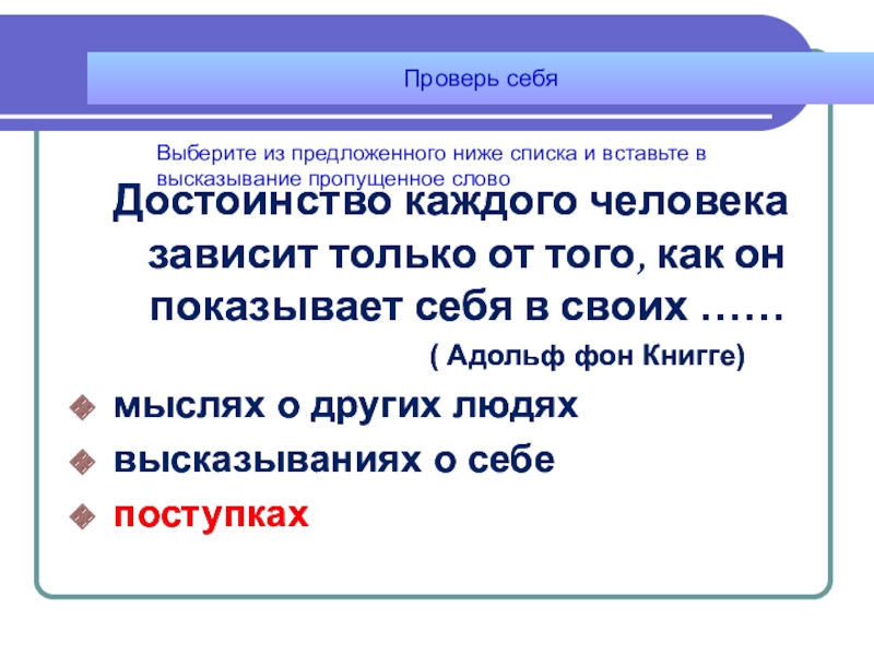 Достоинство каждого человека зависит только от того, как он показывает себя в своих ……