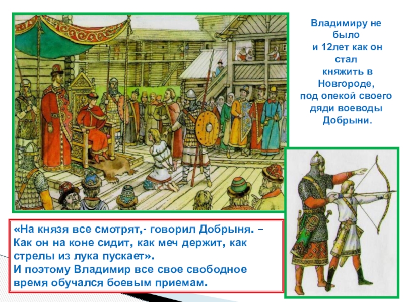 «На князя все смотрят,- говорил Добрыня. – Как он на коне сидит, как меч держит, как стрелы из лука пускает».