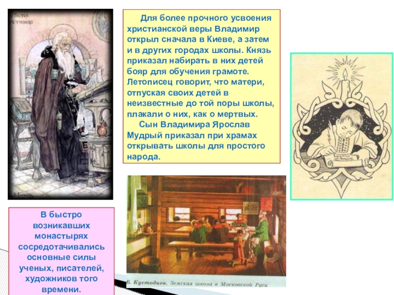 В быстро возникавших монастырях сосредотачивались основные силы ученых, писателей, художников того времени.