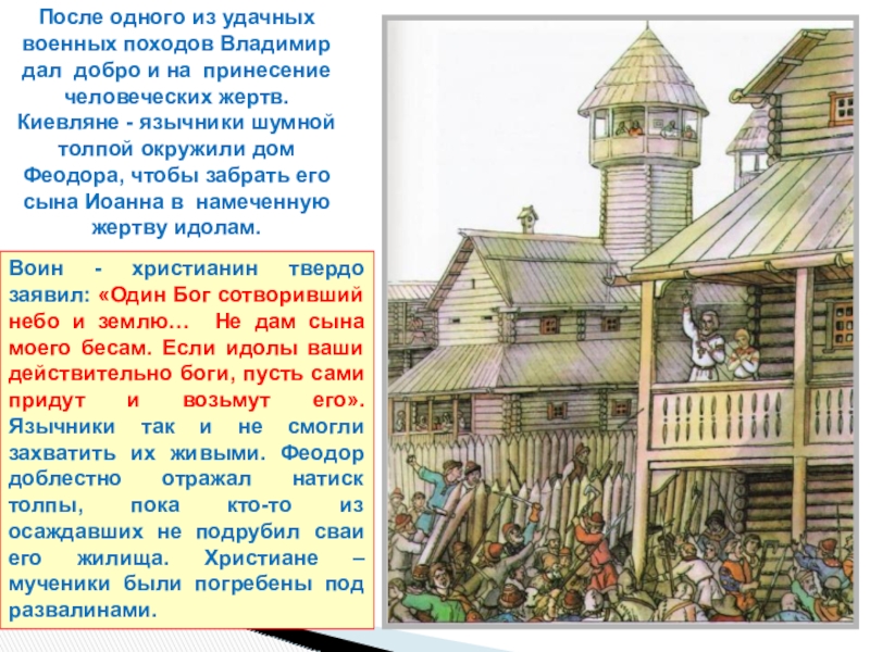 Воин - христианин твердо заявил: «Один Бог сотворивший небо и землю… Не дам сына моего бесам. Если идолы ваши действительно боги, пусть сами придут и возьмут его». Язычники так и не смогли захватить их живыми. Феодор доблестно отражал натиск толпы, пока кто-то из осаждавших не подрубил сваи его жилища. Христиане – мученики были погребены под развалинами.