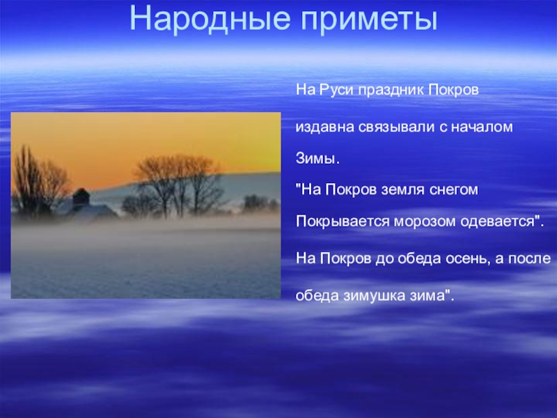 Народные приметыНа Руси праздник Покров  издавна связывали с началом Зимы.