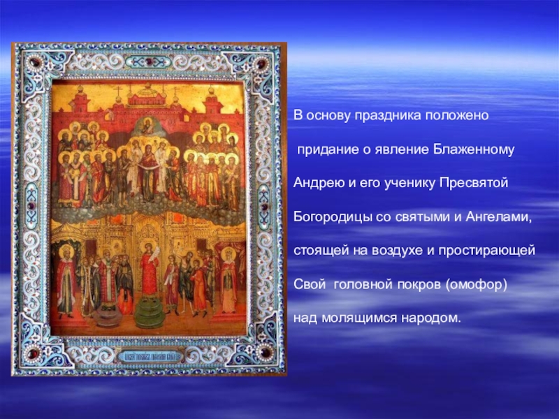 Слайд 4В основу праздника положено придание о явление Блаженному Андрею и его ученику