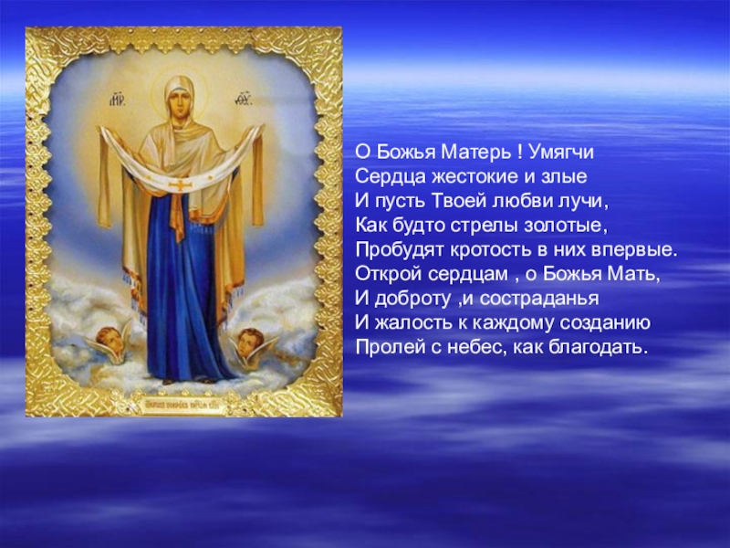 Слайд 2О Божья Матерь ! Умягчи Сердца жестокие и злые И пусть Твоей