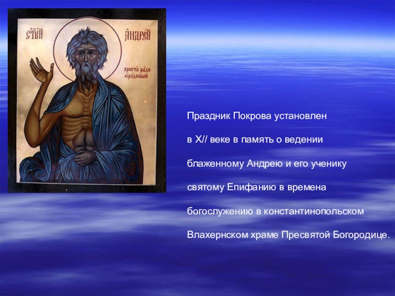 Праздник Покрова установлен   в Х// веке в память о ведении   блаженному Андрею и