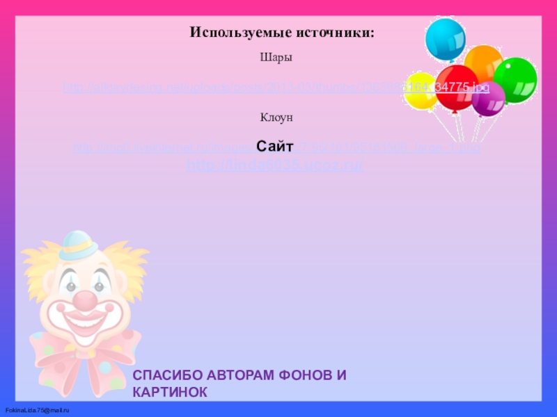 Используемые источники:Шары http://alldaydesing.net/uploads/posts/2013-03/thumbs/1363686164_34775.jpg Клоун http://img0.liveinternet.ru/images/attach/c/7/95/181/95181566_large_1.png