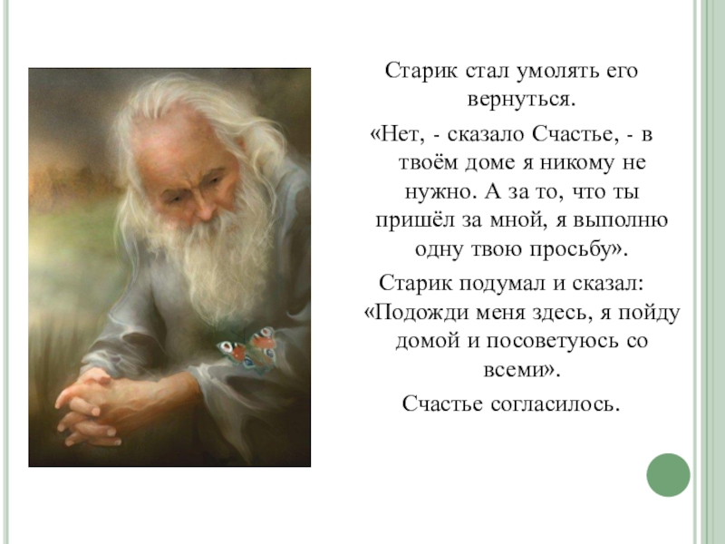 Слайд 9Старик стал умолять его вернуться.