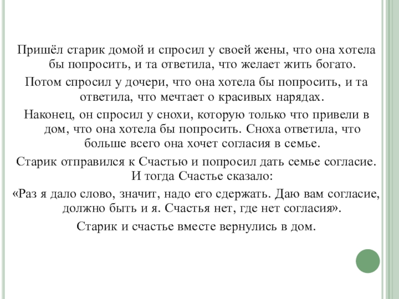 Слайд 10Пришёл старик домой и спросил у своей жены, что она хотела
