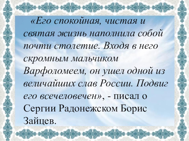 в него скромным мальчиком Варфоломеем, он ушел одной из величайших слав России. Подвиг его всечеловечен», - писал о Сергии Радонежском Борис Зайцев.