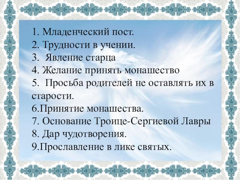 1. Младенческий пост.  2. Трудности в учении. 3. Явление старца 4. Желание принять монашество5. Просьба родителей