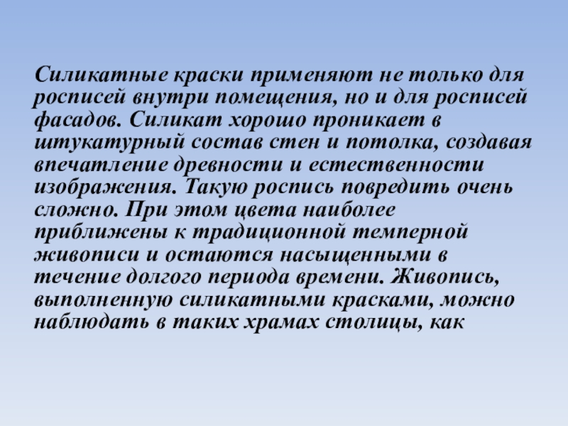 для росписей фасадов. Силикат хорошо проникает в штукатурный состав стен и потолка, создавая впечатление древности и естественности изображения. Такую роспись повредить очень сложно. При этом цвета наиболее приближены к традиционной темперной живописи и остаются насыщенными в течение долгого периода времени. Живопись, выполненную силикатными красками, можно наблюдать в таких храмах столицы, как