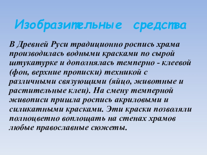 штукатурке и дополнялась темперно - клеевой (фон, верхние прописки) техникой с различными связующими (яйцо, животные и растительные клеи). На смену темперной живописи пришла роспись акриловыми и силикатными красками. Эти краски позволяли полноцветно воплощать на стенах храмов любые православные сюжеты.