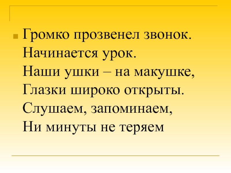 Слайд 2Громко прозвенел звонок. Начинается урок. Наши ушки – на макушке, Глазки широко открыты. Слушаем, запоминаем, Ни
