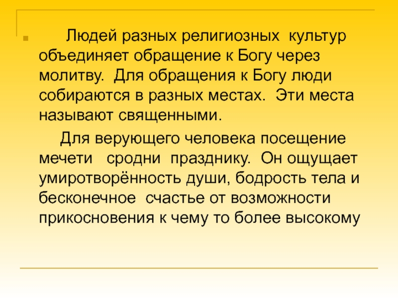 через молитву. Для обращения к Богу люди собираются в разных местах. Эти места называют священными.