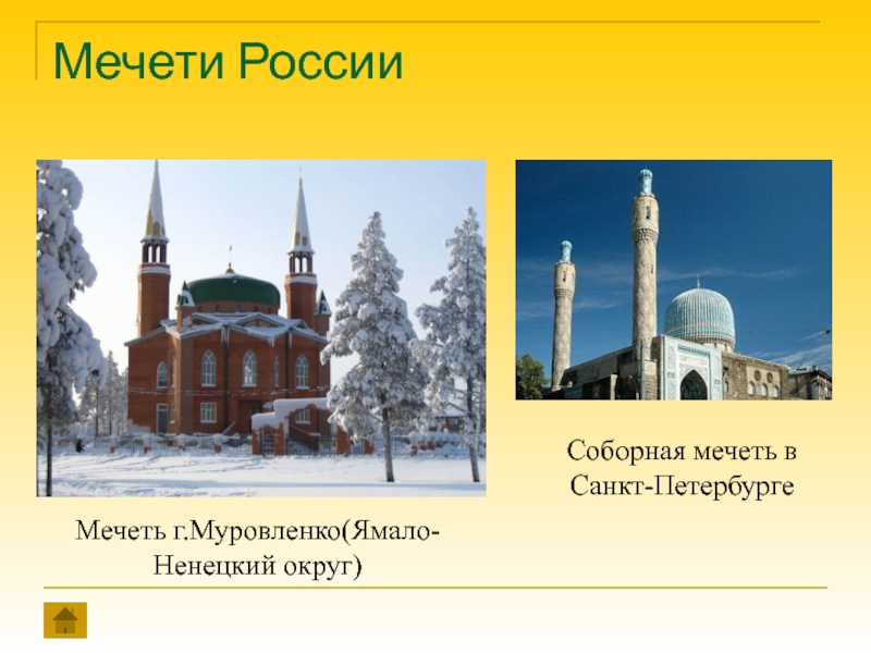 Мечети РоссииМечеть г.Муровленко(Ямало-Ненецкий округ) Соборная мечеть в Санкт-Петербурге