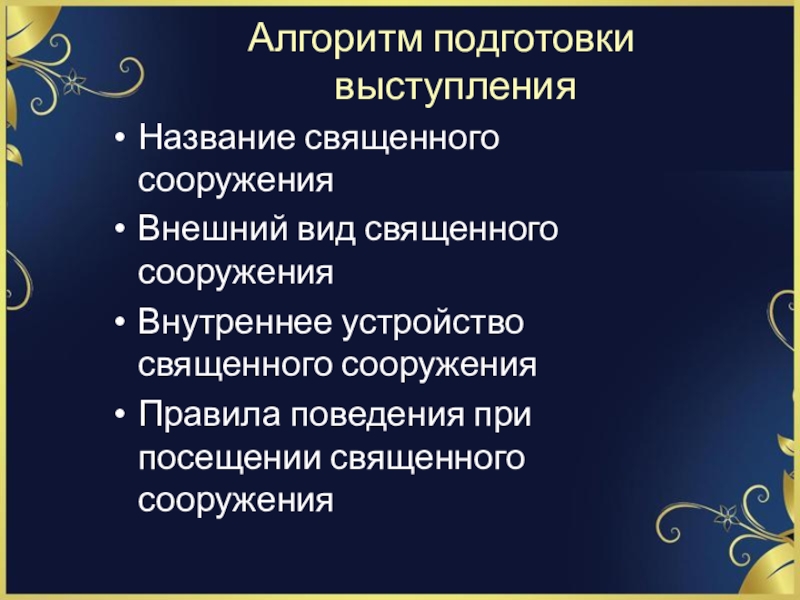 Алгоритм подготовки выступленияНазвание священного сооруженияВнешний вид священного сооруженияВнутреннее устройство священного сооруженияПравила поведения при посещении священного сооружения