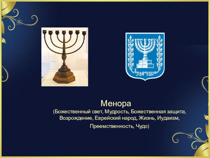 Слайд 12Менора (Божественный свет, Мудрость, Божественная защита, Возрождение, Еврейский народ, Жизнь, Иудаизм, Преемственность,