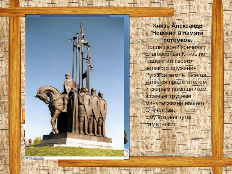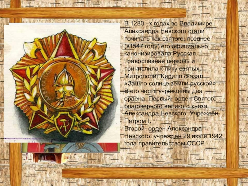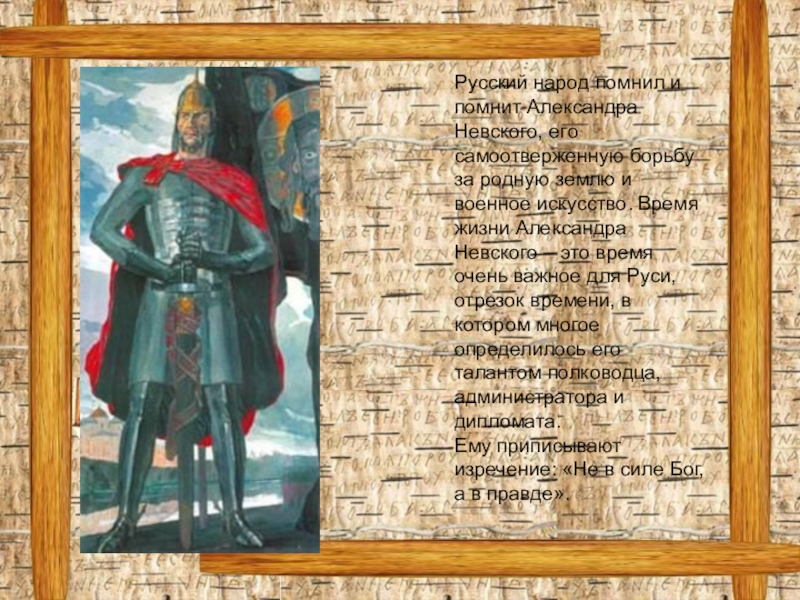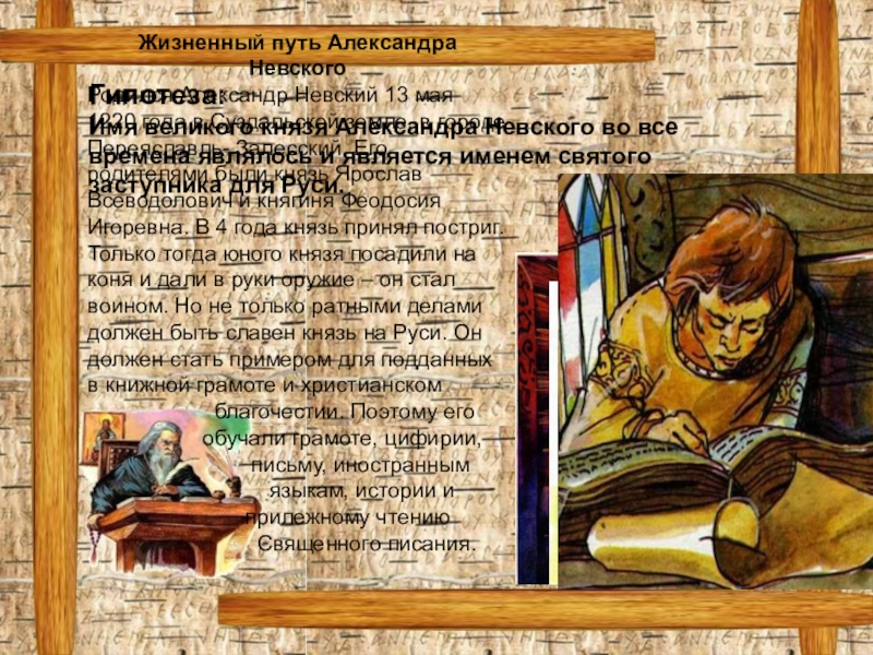 Родился Александр Невский 13 мая 1220 года в Суздальской земле, в городе Переяславль- Залесский. Его родителями были князь Ярослав Всеводолович и княгиня Феодосия Игоревна. В 4 года князь принял постриг. Только тогда юного князя посадили на коня и дали в руки оружие – он стал воином. Но не только ратными делами должен быть славен князь на Руси. Он должен стать примером для подданных в книжной грамоте и христианском
