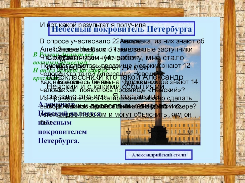 Из проведённого анкетирования можно сделать вывод, что мои одноклассники знают об Александре Невском и могут объяснить ,кем он был.