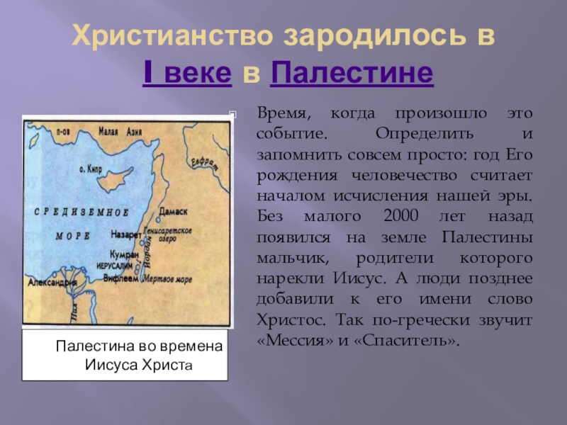 Определить и запомнить совсем просто: год Его рождения человечество считает началом исчисления нашей эры. Без малого 2000 лет назад появился на земле Палестины мальчик, родители которого нарекли Иисус. А люди позднее добавили к его имени слово Христос. Так по-гречески звучит «Мессия» и «Спаситель».