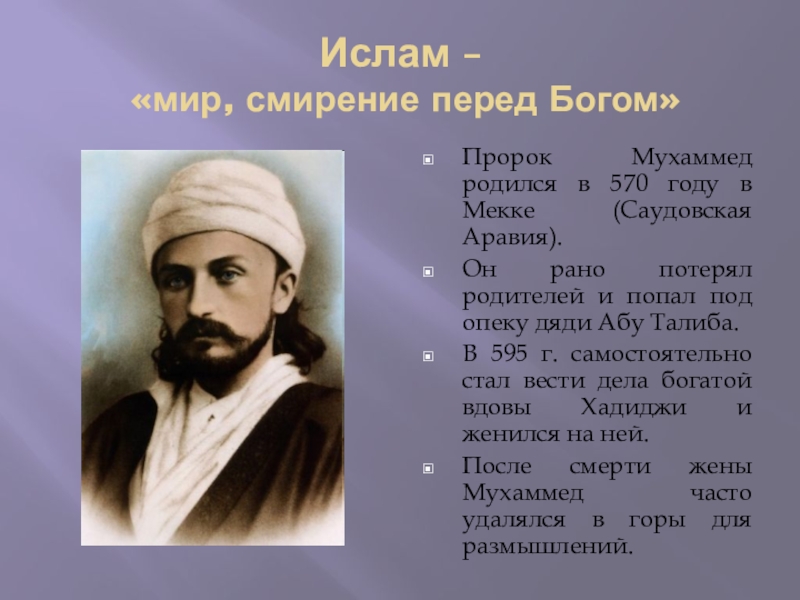 Он рано потерял родителей и попал под опеку дяди Абу Талиба.