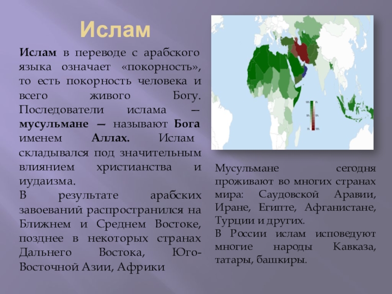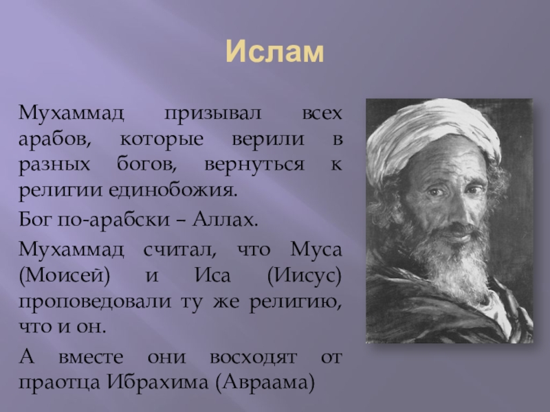 человека и всего живого Богу. Последователи ислама — мусульмане — называют Бога именем Аллах. Ислам складывался под значительным влиянием христианства и иудаизма.