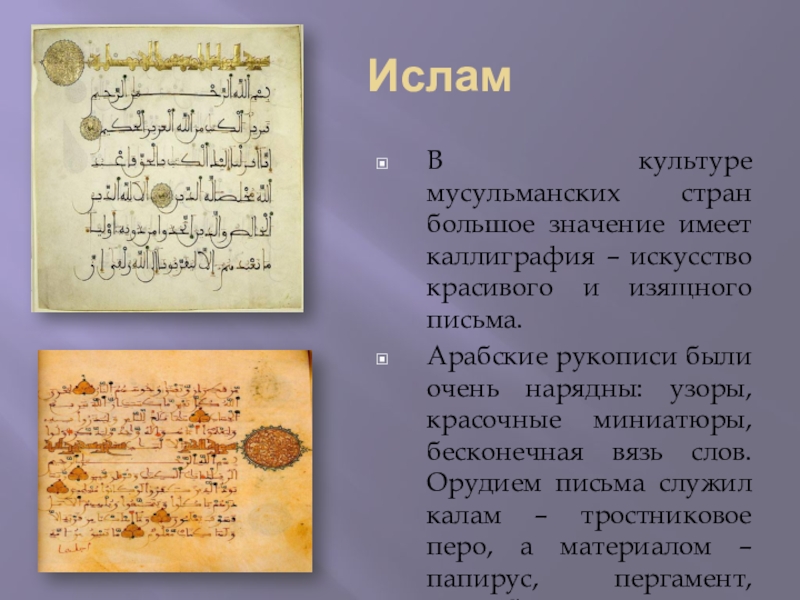 Арабские рукописи были очень нарядны: узоры, красочные миниатюры, бесконечная вязь слов. Орудием письма служил калам – тростниковое перо, а материалом – папирус, пергамент, шелк, бумага.