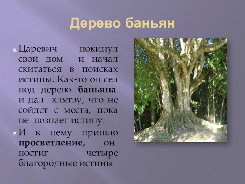 Как-то он сел под дерево баньяна и дал клятву, что не сойдет с места, пока не познает истину.