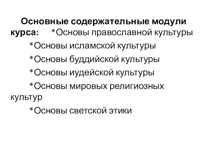 Основные содержательные модули курса:   *Основы православной культуры	  *Основы исламской культуры